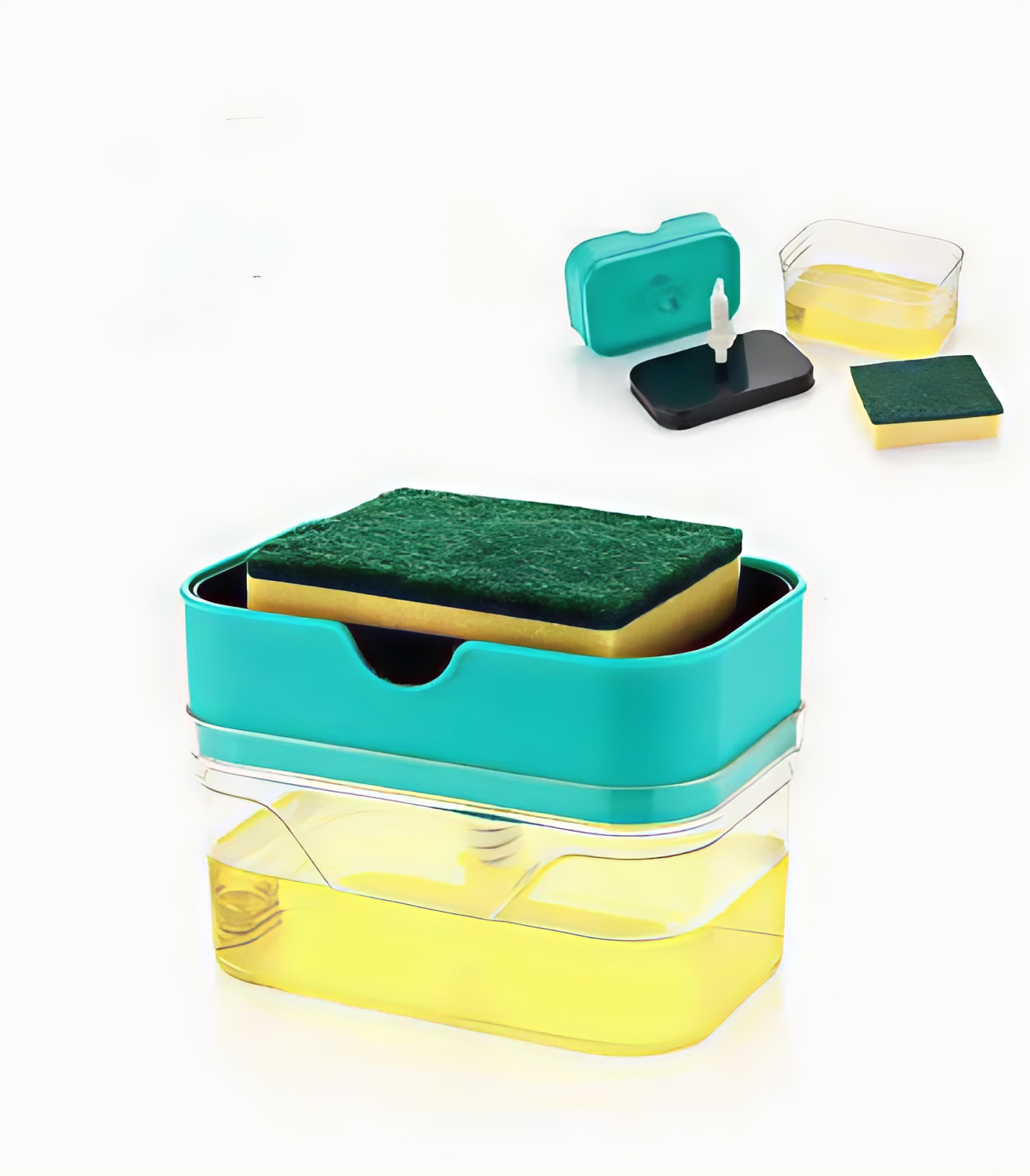 Make dishwashing faster and more convenient with the 2-in-1 Dish Soap Dispenser with Sponge Holder. Designed for efficiency and cleanliness, this dispenser combines a soap container and sponge tray into one compact unit. Simply press the sponge down on the pump plate to dispense the perfect amount of dish soap directly onto it—no mess, no waste. Its transparent base lets you easily monitor soap levels, while the non-slip design ensures stability on your countertop. Perfect for homes, kitchens, and restaurants.