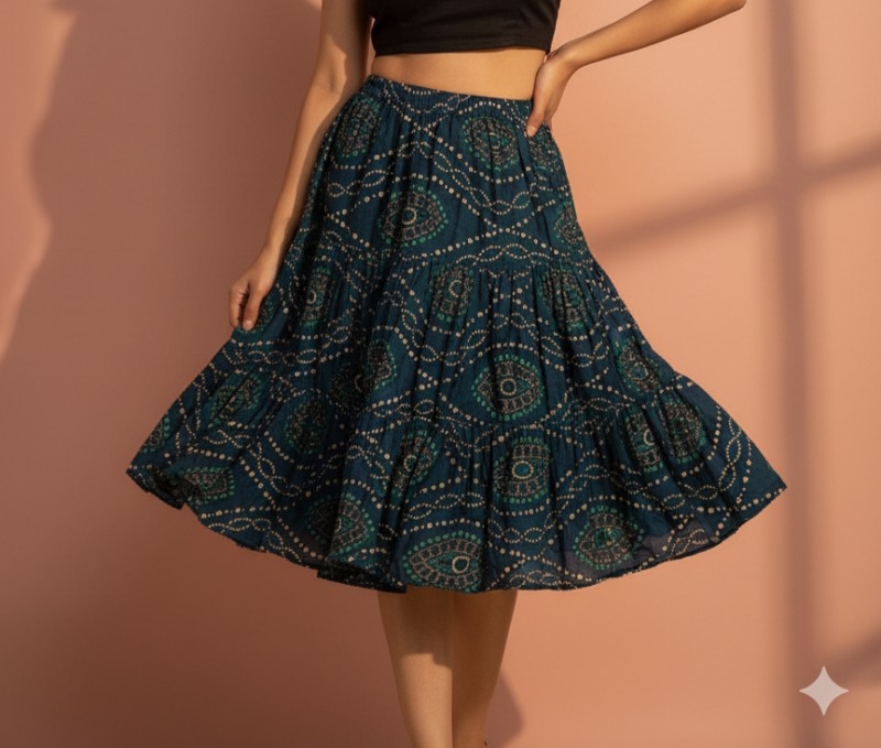 - Skirt Color: Teal/Petrol Blue with Bandhani/Tie-Dye inspired print.