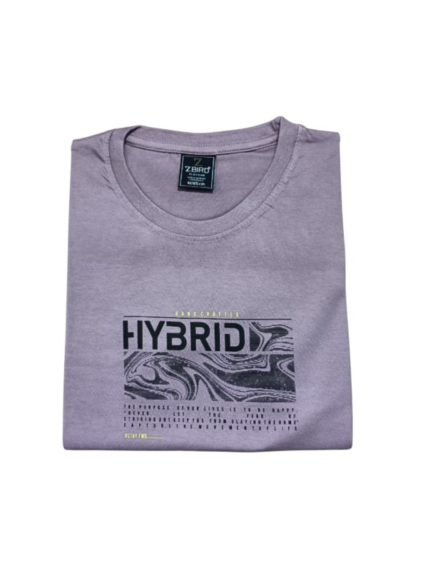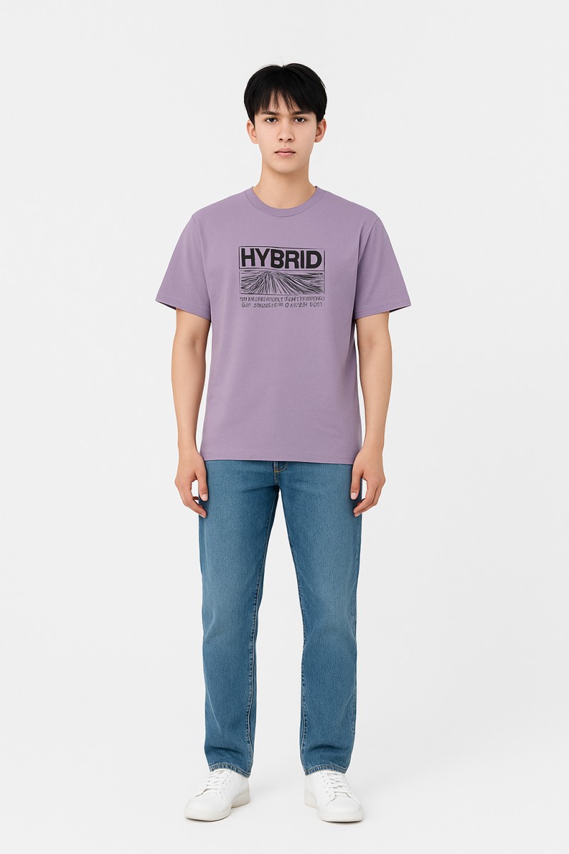 This modern Graphic T-Shirt features a distinct Lavender or Mauve color, offering a fresh, contemporary alternative to classic casual tops. The central graphic is a black, box-style design that reads “HYBRID” above an illustration of a vanishing point or road/field perspective, combined with technical or coordinate text below. The overall graphic aesthetic is futuristic, minimalist, or tech-inspired. The shirt is cut in a standard, comfortable fit, which is ideal for relaxed, everyday wear. Made from what appears to be a soft, durable cotton fabric, it pairs effortlessly with denim and white sneakers for a clean, stylish casual look.