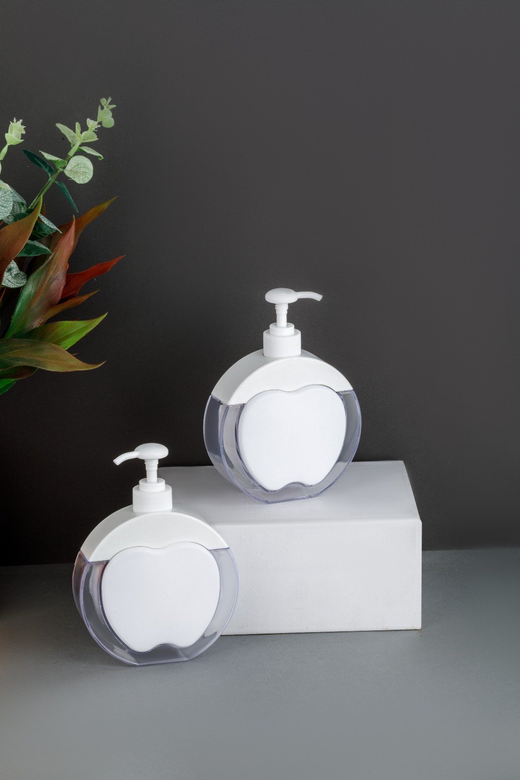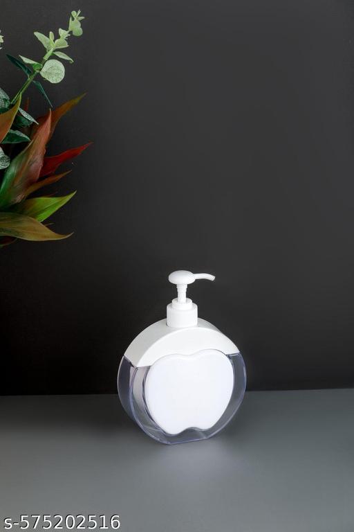 A stylish and decorative pump bottle for liquids. The design features a round bottle with an interior shape that resembles an apple or a heart, making it a unique accessory for a bathroom countertop or kitchen sink. It is used to dispense liquid soap, hand sanitizer, lotion, or dish soap.