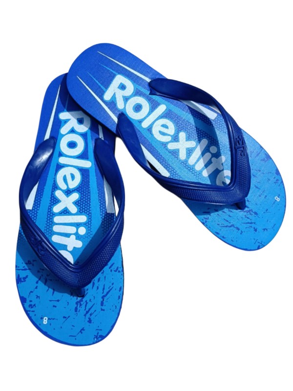 A pair of casual, durable, and comfortable thong-style flip-flops suitable for everyday, casual, or beach/poolside wear. The design features a bold print on the footbed with the brand name “Rolexit” in a prominent red font, contrasting with a gray and dark blue speckled/abstract pattern. They are designed for easy slip-on wear, providing a relaxed and practical footwear option.