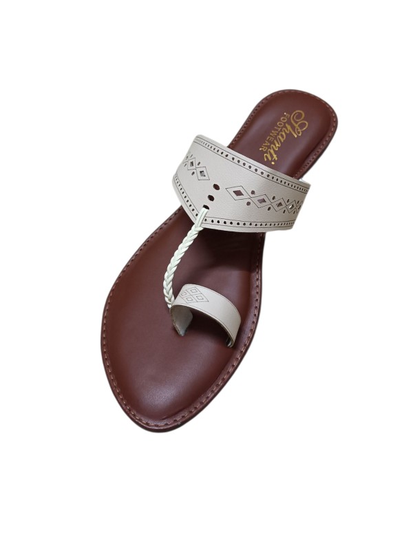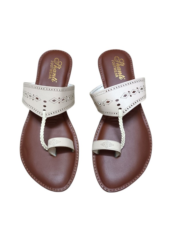 Add a touch of ethnic elegance to your footwear collection with these beautifully handcrafted Kolhapuri-style flats. Designed with a cream upper strap featuring intricate cut-out patterns and a braided toe loop for a traditional charm, these flats perfectly blend comfort and style. The rich brown sole enhances the overall look, making them ideal for both casual and festive wear. Lightweight and durable, these flats are perfect for pairing with ethnic outfits or casual wear.
